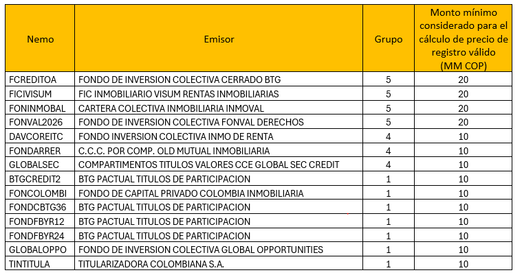 Los títulos participativos a los que aplica la metodología de valoración, de acuerdo con lo estipulado en la Circular Eterna 006 de 2021 de la Superintendencia Financiera de Colombia, que no están especificados en la tabla anterior, quedarán asignados al Grupo 1.